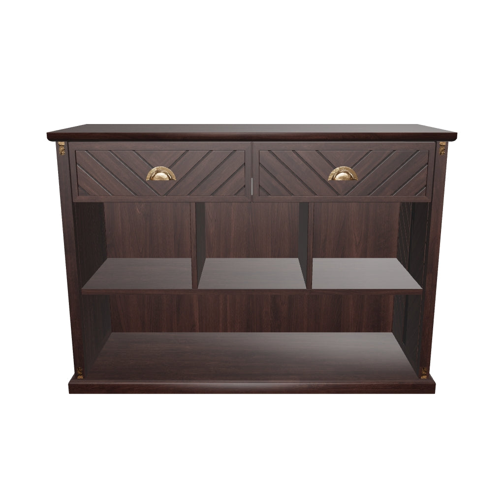 Add beauty and functionality to your home with the multifunctional Chelsea dresser. Crafted from high-quality solid Mahogany wood/veneer with a catalyzed lacquer topcoat, this dresser’s walnut finish accentuates a unique natural wood grain feel that blends flawlessly with any interior. Compact, elegant and clean-lined, this dresser with diagonal grooved design showcases two drawers, three open compartments, and one large cubby space that offers plenty of storage space, making it ideal to display or store a variety of items. Embellished with antique golden motifs and metallic drawer pull-outs, this striking piece is sure to elevate your interior setting. Pair this elegant dresser with the Chelsea mirror, bed and bed side tables for a complete look.
