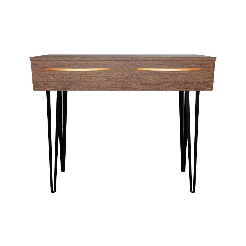 Bring style and luxury to any interior with our chic Cresta Grand dresser. Crafted from premium MFC, this elegant piece has a rich walnut tex finish that exudes sophistication and warmth. The spacious tabletop offers ample room for displaying your favorite decor items, accessories, or daily essentials, making it as practical as stylish. Designed with two roomy drawers, it features striking golden oxidized handles that add a touch of luxury while ensuring easy access to your belongings. Supported by sleek, sturdy hairpin legs, the Cresta Grand Dresser seamlessly blends durability with modern aesthetics. Transform your living space with this chic and versatile piece, perfect for keeping your home organized and elegant.