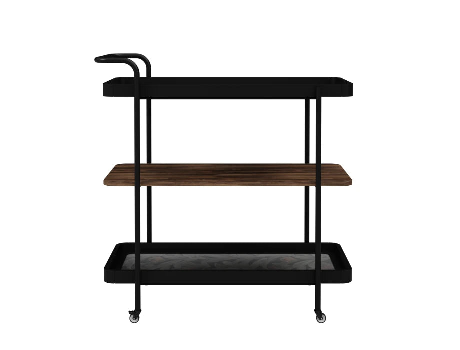 The Otis Glass Trolley combines modern style with practicality. It features a sleek metal frame made of MS pipe with a black powder-coated finish, giving it an industrial look. The top and bottom trays are crafted from HDF, painted black, and covered with tempered lack painted glass featuring a subtle frosted printed sheet. The middle shelf, made of Marinus Walnut MFC, adds a warm, natural contrast. Equipped with wheel casters for easy mobility, this versatile trolley is perfect for serving, storage, or display.