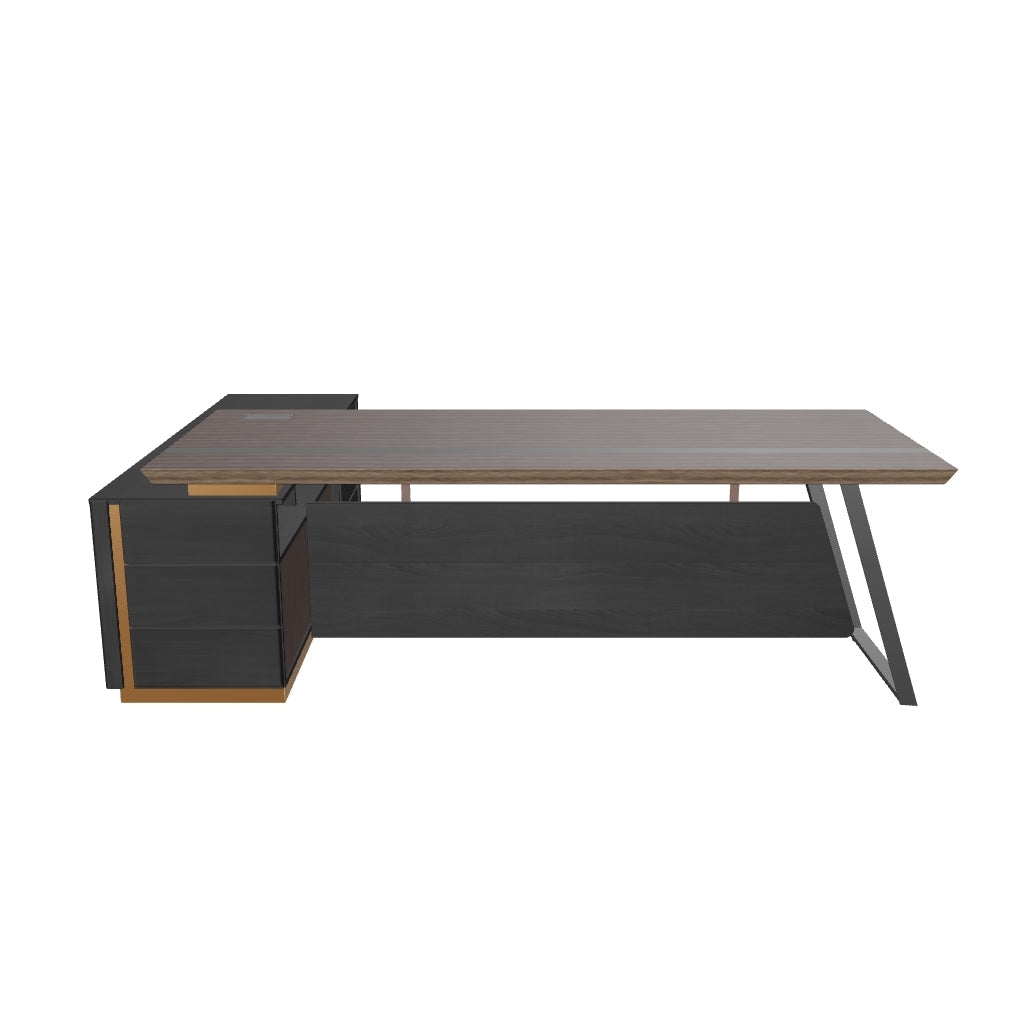 Add a luxurious look to your workspace with this spacious and modern Antonin Desk. Featuring a large tabletop, this desk is meant to fulfil all your office needs, from keeping laptops, desktops, and PCs to paperwork, while also leaving ample space for meetings and collaboration. Antonin comes with matching side rack that streamline your workspace by offering spacious storage space and keeping everything on hand. Three large, handle-less drawers with soft-closing full extension channels, two sliding cabinets with locks, and one cubby shelf allow you to store and retrieve all small and medium sized office essentials without skipping on style. The drawers' bases feature a luxurious rust velvet lining, adding a touch of sophistication and opulence. Blending modern design with functionality, Antonin strikes a natural finished brown arrow veneer top with an inlay design and vanity panel in black stained beech veneer, which adds to its sleek beauty while exuding warmth and timelessness into any office setting. The cable cover keeps the cords and cables in order, while the sockets beneath keep your devices charged up. The golden PVD stainless-steel base with glides ensures lasting stability and adds a splash of style to any workspace. Pair this chic piece with Antonin executive chair, credenza, center and side table, and Antonin sofa for a cohesive and stylish office environment.