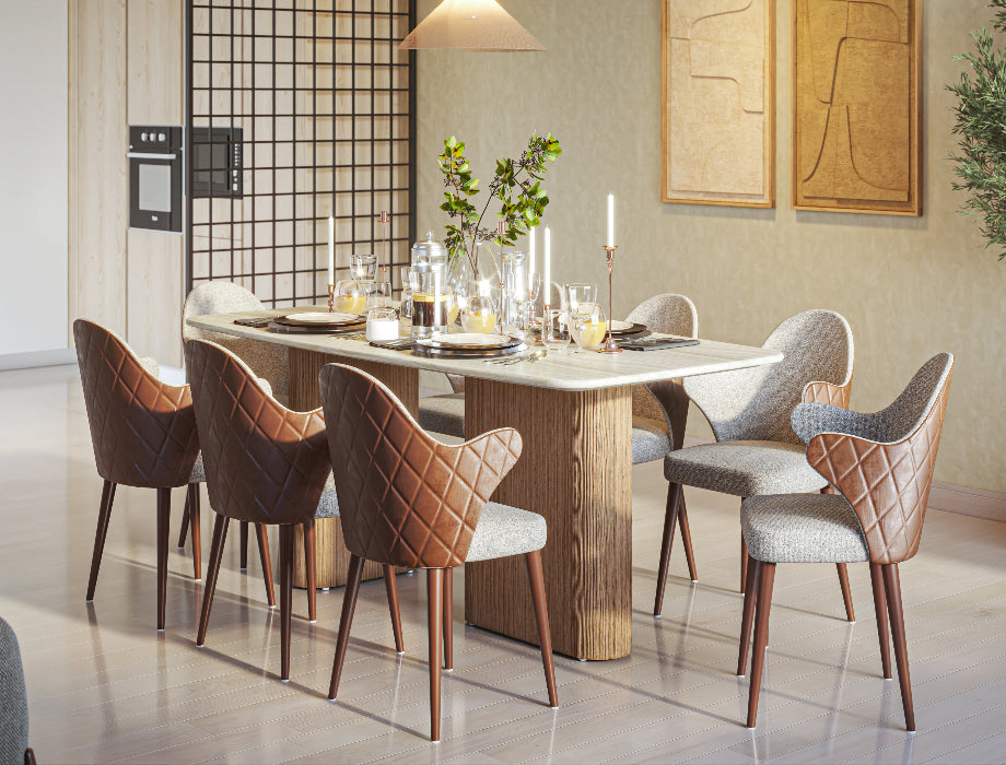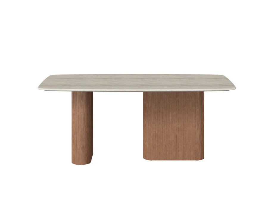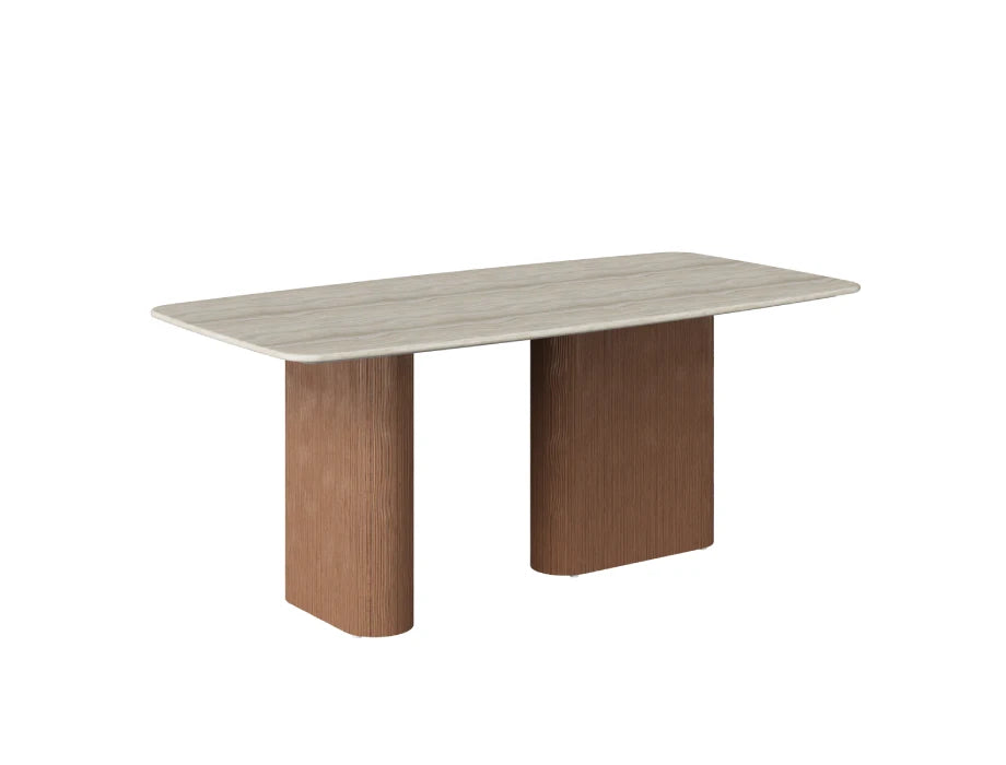 The Loria Dining Table exudes contemporary elegance with its minimalist yet bold design. The spacious travertine top features smooth, rounded edges, creating a soft and sophisticated silhouette. Its natural stone finish showcases unique patterns, adding a touch of luxury and organic beauty. The table is supported by two sturdy bases crafted from walnut wavy flutes, giving a distinctive, sculptural appeal. This innovative design not only ensures stability but also enhances its modern aesthetic. With its clean lines and vintage tones, the Loria Dining Table seamlessly integrates into any dining space, offering both style and functionality. Club with Melody dining chair for seating.