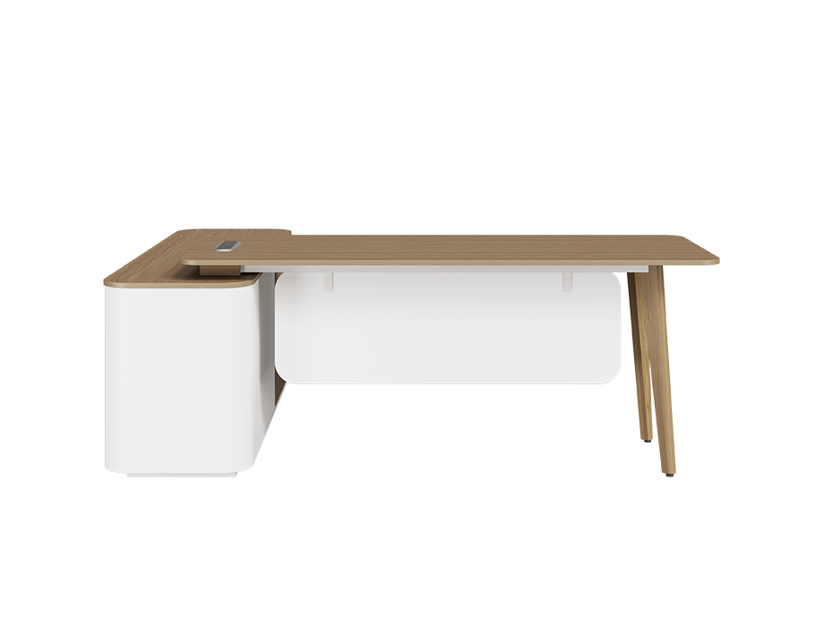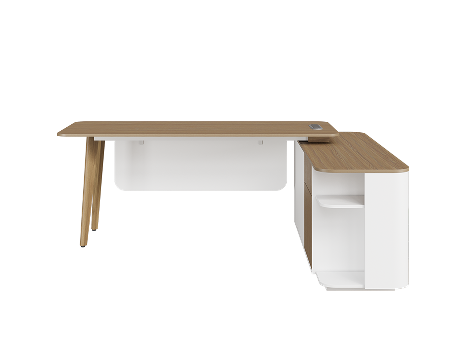 Elevate your workspace with the Orwell Manager Desk – a seamless blend of style, functionality, and ergonomic design. Featuring a generously sized classic ash laminated top and a sleek white laminated vanity panel, this desk offers a professional aesthetic while ensuring practicality. The curved side rack, finished in a mix of classic ash and white laminations, adds visual interest and offers multi-functional storage for everyday office essentials. Supported by natural finish ash wood legs, Orwell combines a spacious layout with smart cable management, making it ideal for modern office setups.