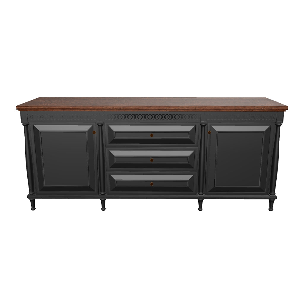 Elevate your space with the Marcus credenza—a perfect fusion of elegance and functionality. Expertly crafted from high-quality ash wood/rich oak veneer and finished with sleek black stain, this credenza radiates modern sophistication with lasting durability. The top showcases a beautifully detailed inlay design, adding a touch of refined artistry to its structure. With three spacious drawers and two shuttered compartments, each with a fixed shelf, it offers ample storage to keep your essentials neatly organized. The metallic knobs with a golden finish add a luxurious touch, while the sturdy wooden legs ensure lasting durability. The spacious top provides the ideal surface for displaying décor, storing files, or hosting your coffee break essentials, making Marcus credenza a practical and stylish statement into any office environement.