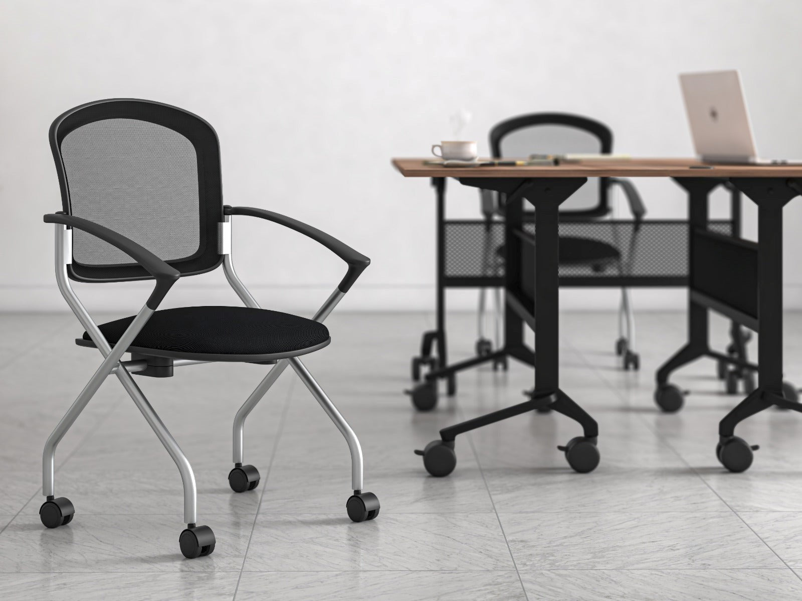 Discover practical and compact seating with our folding visitor chair. Designed for comfort and space saving, this chair’s foldable design allows the chair to be quickly and easily stored away, making it an ideal solution for temporary seating arrangements. Featuring a mesh back for breathability and fabric padded seat for comfort during long hours of sitting, this chair also features built-in lumbar support for proper posture. The sleek grey painted metallic base with castor wheels ensures durability and mobility, while the polypropylene armrests offer additional support. Easy to move and store, this folding visitor chair combines comfort, convenience, and style all in one, making it an excellent choice for halls, conference areas, waiting rooms, meeting rooms and much more.