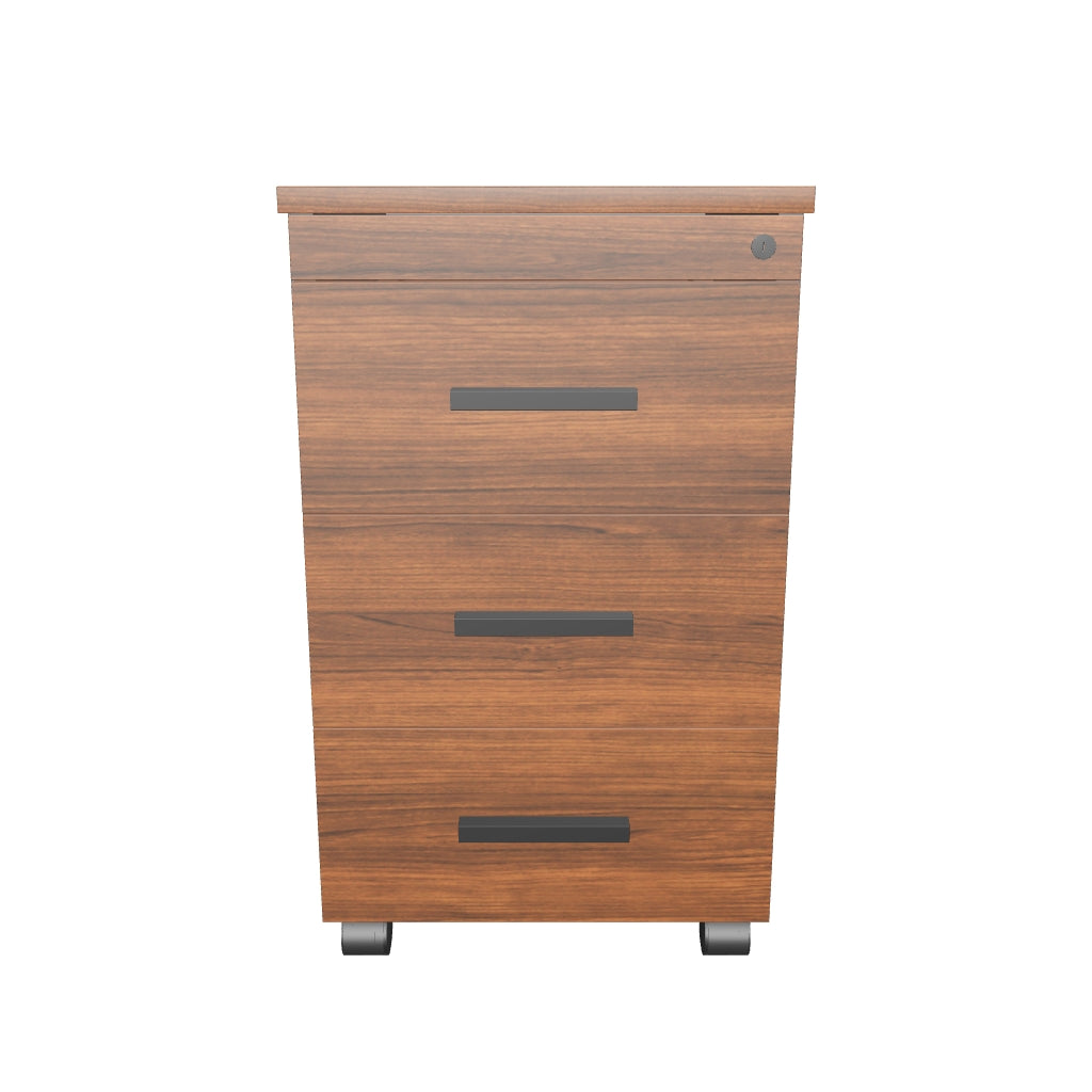 Streamline your workspace with the Omega drawer pedestal, a sleek and functional storage solution. Crafted from durable MFC with a stylish teak and grey finish, this pedestal offers three spacious drawers secured by a single lock, ensuring your essentials remain safe and organized with just one turn. The metallic handles with a grey powder-coat finish add a touch of modern elegance, while the sturdy nylon castor wheels provide effortless mobility. Whether you need to store important documents, office supplies, or personal items, the Omega drawer pedestal is designed to keep your workspace tidy and secure, making it an essential addition to any professional environment.