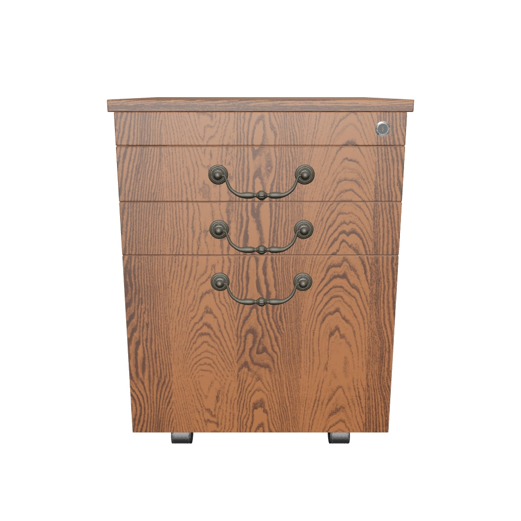 Keep your workspace organized with the Traditional drawer pedestal. Crafted from high-quality ash/oak wood veneer with a rich Jacobean finish, this piece exudes warmth and sophistication while ensuring lasting durability. The antique metallic handles enhance its traditional charm, while the thoughtfully designed storage options with two drawers and a large cabinet—provide ample space for all your office essentials. All compartments can be securely locked with a single lock, ensuring your belongings are safe and organized, making this a perfect storage solution for any office setting.