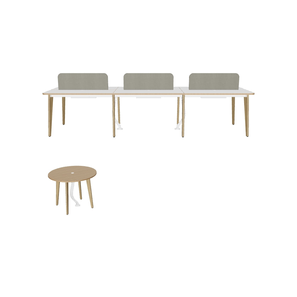 The Orwell Workstation Series brings a perfect balance of style and utility to collaborative office environments. Available in multiple configurations, it features clean white laminated tops and sage-green fabric partitions that add warmth and privacy to each workspace. The workstation stands on sturdy classic ash-stain finish beech wood legs, ensuring long-lasting support and visual appeal. Thoughtfully designed with ample legroom and a wire management system, the Orwell series also includes mobile drawer pedestals for individual storage needs. Its simple and adaptable layout makes it ideal for various professional interiors.