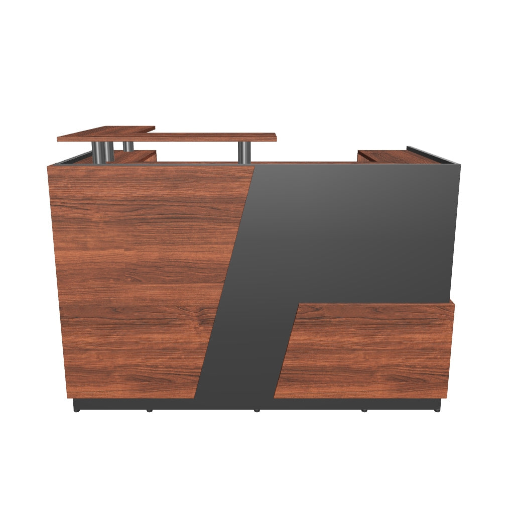 Transform your reception area with the elegant Omega reception counter, combining style with functionality. Featuring a sophisticated teak and grey MFC finish, this counter exudes elegance while offering practical benefits.The spacious top offers ample space for managing paperwork, displaying a company logo, or adding decorative elements while the open inner shelf provides additional storage for all your office essentials.Supported by stainless steel pipe fixings, this counter enssures lasting durability without skipping on style. Carpet glides at the base ensure easy mobility and positioning, making Omega a perfect choice for creating a welcoming and efficient reception space.