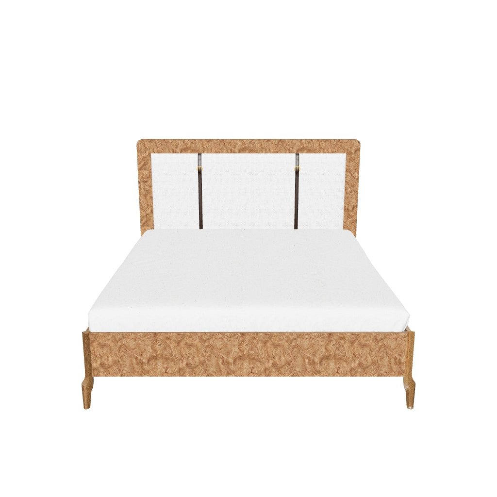 - Bed headboard and footboard crafted with burl veneer, showcasing intricate swirling pattern with unique grains in a luxurious honey maple high-gloss finish, exuding timeless beauty.
