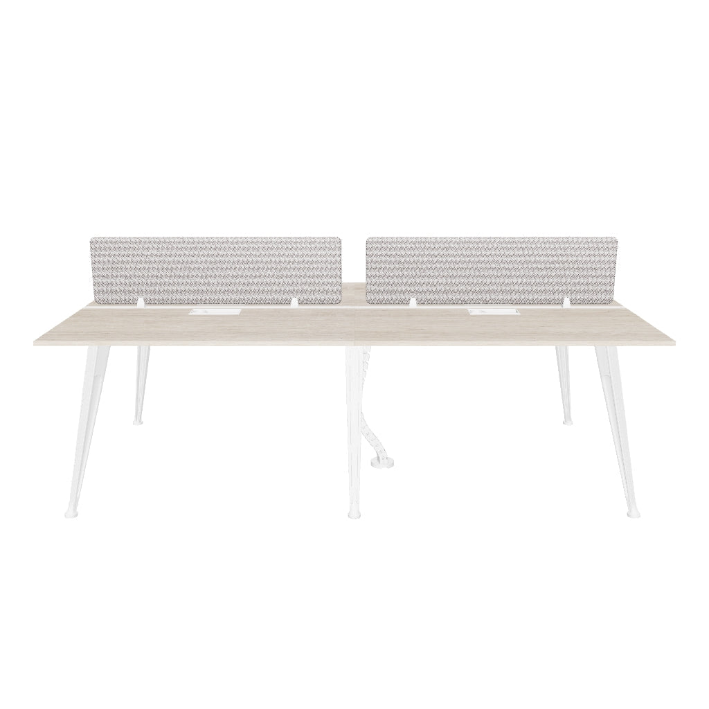 Create an efficient and organized workspace with the compact Ariel 4-person linear workstation. Featuring a contemporary design, this stylish linear workstation offers ample table top space for one with the advantage of a soft board partition in mesh grey fabric for privacy and a place to tack notes and pictures. The surface is crafted from Aland Pine MFC in fine brushed lines with knots atop a white powder-coated aluminum casted metal base for sleek and modern look. A built-in stationery tray and spine cable management solution help keep items and wires neatly organized and concealed. Extend this linear configuration to add more efficient workspace for unlimited amounts of individuals (depending on your space and needs). Personalize this workstation with a variety of add-ons such as dual-purpose storage partitions, drawer pedestals, CPU trolleys and more to maximize its utility.