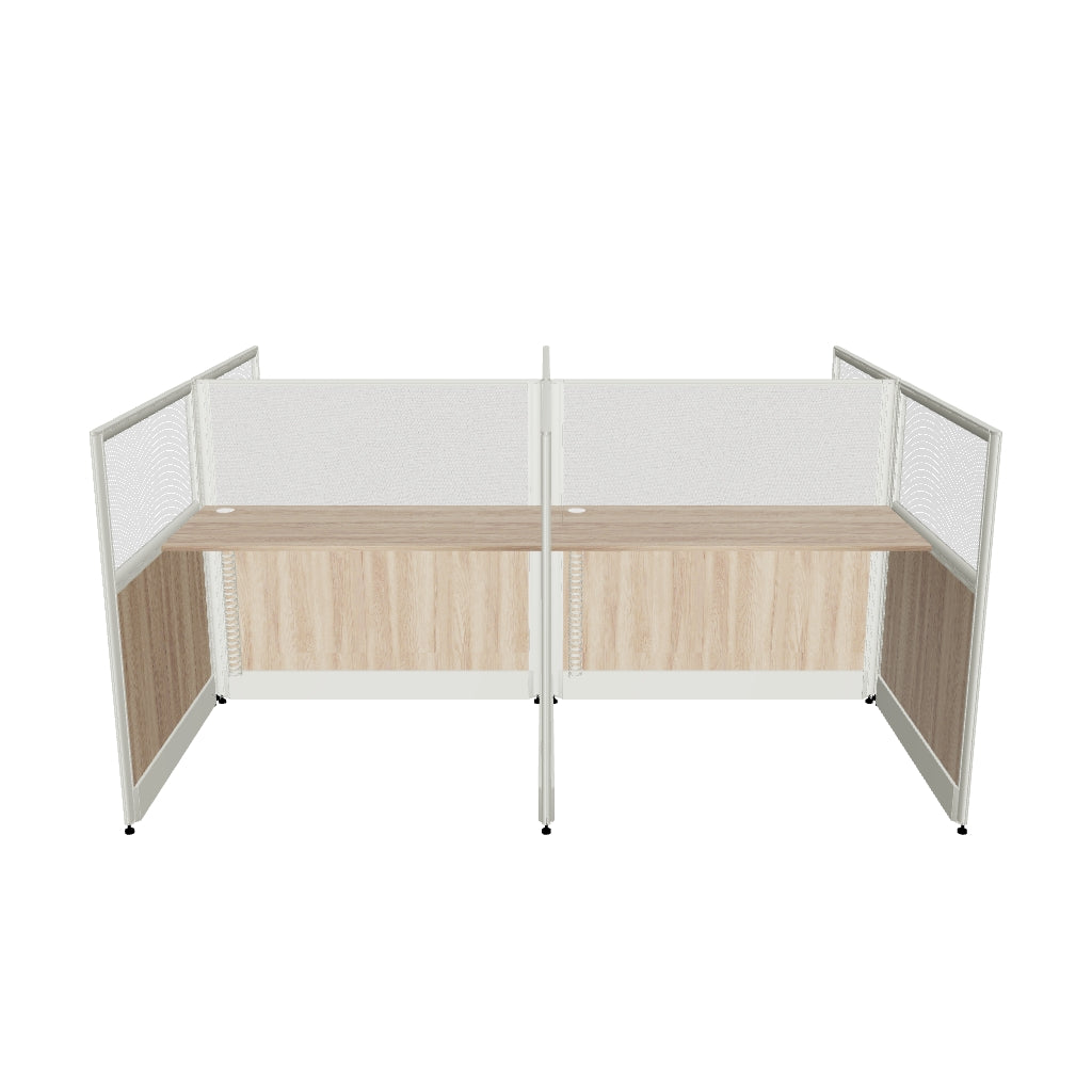 Experience maximum privacy without compromising on productivity with the Budget Pro linear workstation for 4 persons. Designed to ensure privacy, the compact workstation offers an ample workspace surrounded by polycarbonate side partitions that intelligently allow light to illuminate the work area, while a soft board partition with linen grey reduces distractions and provides a convenient place to display notes and reminders. High-quality classic Ash MFC with aluminum channel structure with grey powder-coat ensure durability for years to come while adjustable floor glides at the base offers stability and floor protection. The integration of wire-cup and spine cable management offer an organized and clutter-free office environment, making it an ideal addition to modern workspaces. Its modular design also allows additional workstations to be added for any number of users making it the perfect solution for all offices. Pair this with matching Budget Pro drawer pedestal or CPU trolley for maximum storage and functionality.