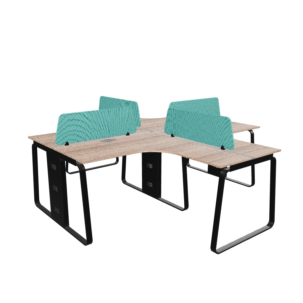Experience versatility and efficiency with our Lunar grid workstation for 4 persons. The natural veneer top paired with a sleek metallic base in black powder coat creates a stylish and functional workspace. The addition of a teal twill fabric partition with cork sheet offers privacy, creating a conducive work atmosphere, while the inclusion of riser, integrated into the metallic base, provides a convenient hub for sockets, charging ports, and other devices. With vertical cable management for a clean appearance and a horizontal cable tray beneath the desk, this workstation ensures organized cables and clutter-free work environment. Adjustable rubber glides ensure adaptability to any floor surface, offering stability and convenience, making this workstation a practical addition into any office space. Pair this with the Dawn manager chair, Lunar drawer pedestal, side rack, or fling cabinets for maximization of storage space and functionality.