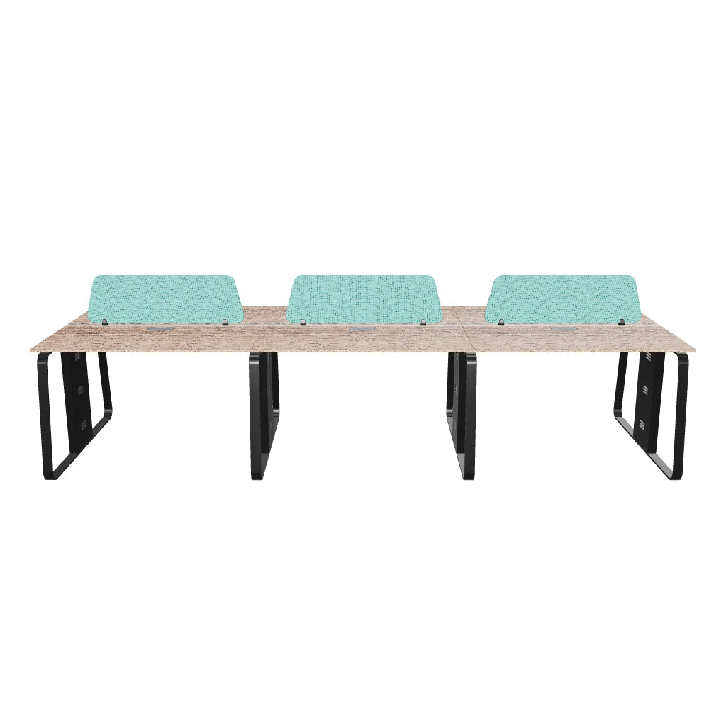 Experience versatility and efficiency with our Lunar Linear workstation for 6 persons. The natural veneer top paired with a sleek metallic base in black powder coat creates a stylish and functional workspace. The addition of a teal twill fabric partition with cork sheet offers privacy, creating a conducive work atmosphere while the inclusion of riser, integrated into the metallic base, provides a convenient hub for sockets, charging ports, and other devices. With vertical cable management for a clean appearance and a horizontal cable tray beneath the desk, this workstation ensures organized cables and clutter-free work environment. Adjustable rubber glides ensure adaptability to any floor surface, offering stability and convenience, making this workstation a practical addition into any office space. Pair this with Dawn manager chair, Lunar drawer pedestal, side rack, or fling cabinets for maximization of storage space and functionality.