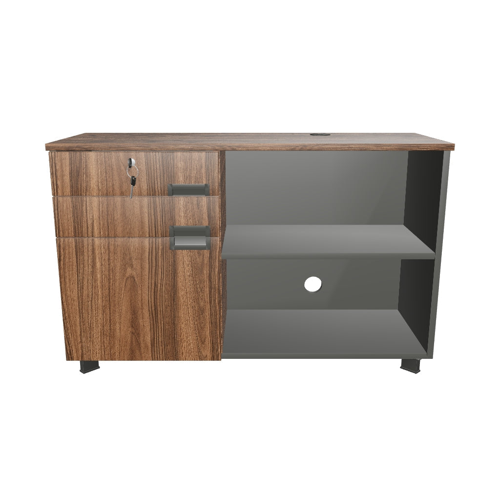Maximize your workspace efficiency with the sleek and functional Ozone 2.0 side rack. Crafted from a combination of Noce Prenne and charcoal grey MFC, this side rack exudes warmth and elegance into any office space. Equipped with two drawers (one with lock for secure storage)—and a large cabinet—it offers versatile organization solutions. The open shelf provides easy access to frequently used items while the spacious top is perfect for holding office essentials. Its sturdy metallic legs and footings ensure lasting stability and durability, while the built-in wire cup offers convenient cable management to keep things tidy, making it a practical addition to any workspace. Pair it with a matching desk and credenza for a seamless, and unified office setup.