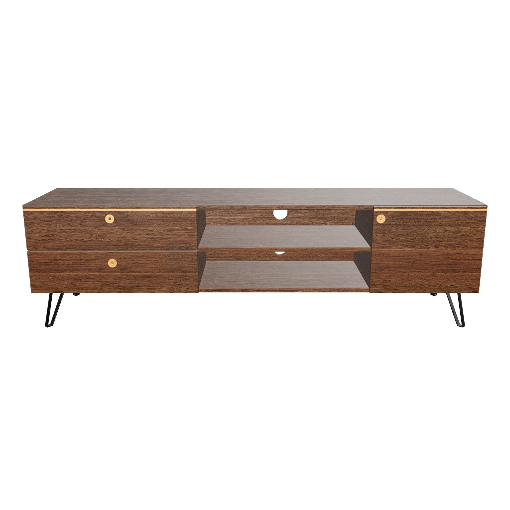 Looking for a neat and stylish way to display your TV and supporting devices? This Cresta Grand media unit is the perfect solution. Compact, chic, and clean-lined, this media unit with a rectangular silhouette can be placed under a wall-mounted LED TV or support one (up to 65”) on the spacious top shelf, making it ideal for living rooms, bedrooms, gaming rooms, and more. Finished in walnut tex, the high-quality MFC and black powder-coated hairpin metallic legs exude warmth into any space. Two center cubby shelves with wire cut holes provide plenty of space for amplifiers, decoders, WiFi routers, and other devices, while a pair of drawers and one large cabinet offer additional concealed storage for remotes and other items. The wire cut holes allow devices to be interconnected while keeping messy cables out of sight, making it a chic addition to any living space.
