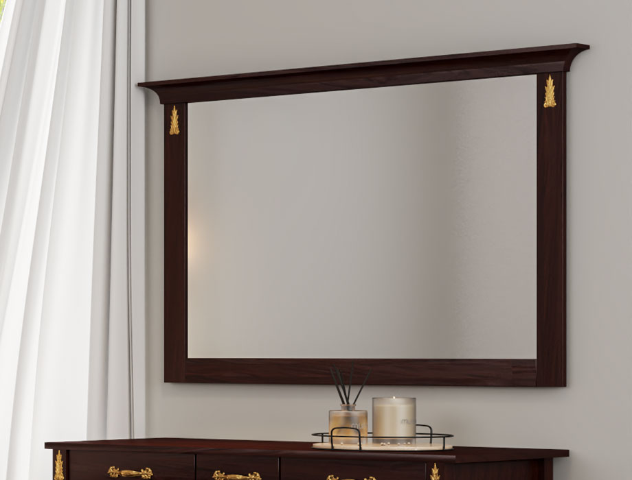 Elevate your bedroom décor with the classic charm of Sienna mirror. Crafted with a durable mahogany wood frame and finished in a luxurious smoked walnut veneer, this mirror adds a touch of elegance to any space. The two metallic motifs adorning the top edges, finished in antique brass, provide a unique vintage flair. From hung above the matching sienna dresser or on its own, this mirror enhances any room's aesthetics and functionality.