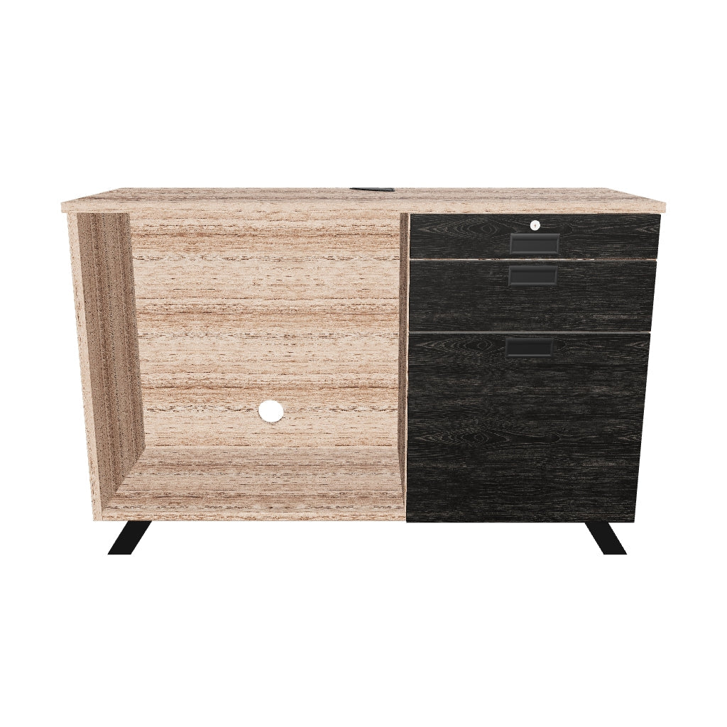 Transform your office space with the Lunar side rack, a perfect blend of style and functionality. Crafted with precision, this side rack features a smaller lockable drawer, a spacious large drawer, and a convenient cabinet, offering ample storage for your office essentials. The brushed oak MFC drawer heads and shutter, combined with a natural veneer carcass, provide a touch of elegance to your workspace. Designed for a clutter-free environment, this side rack includes a triangular cable cover and a cutout at the back, ensuring seamless cable management. The black powder-coated metallic handles add a modern touch, while the metal put-in tapered legs provide stability and durability. Pair this with matching manager desks, drawer pedestals, or filing cabinets for an organized and cohesive work environment.