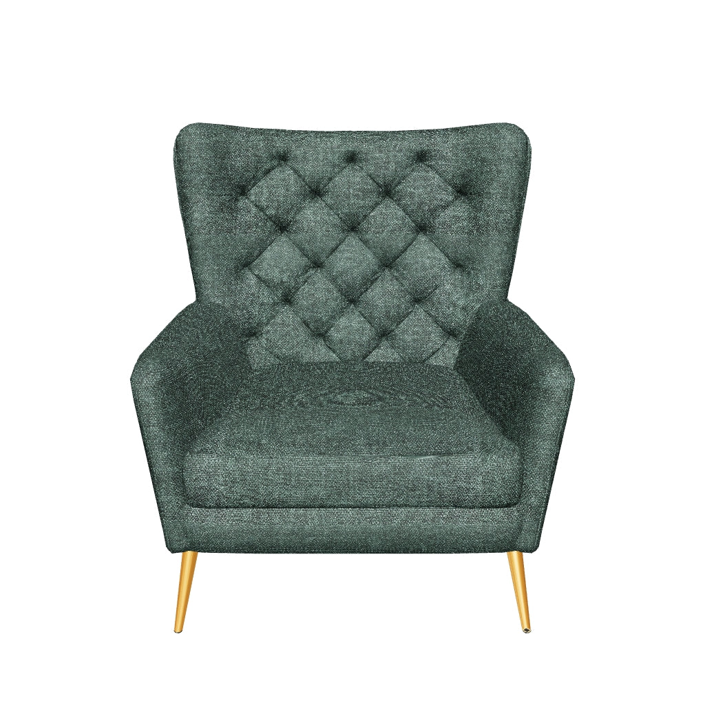 Introducing our opulent Majestic Chair, a masterpiece of comfort and elegance. Comfortable and supportive, it features super flex on the seat for luxurious softness and cloud-like comfort, paired with supreme foam on the back for lasting support during long hours. With a luxurious velvet upholstery in winter green, this chair with a wingback design and tufted backrest offers a visually striking appeal. Sleek metallic legs finished in a stunning golden hue add an additional layer of glamour to the overall design. Use one Majestic chair to fill corners and niches or pair multiple together to create beautiful and comfortable seating spaces in lounges, living rooms, bedrooms, studies and more.