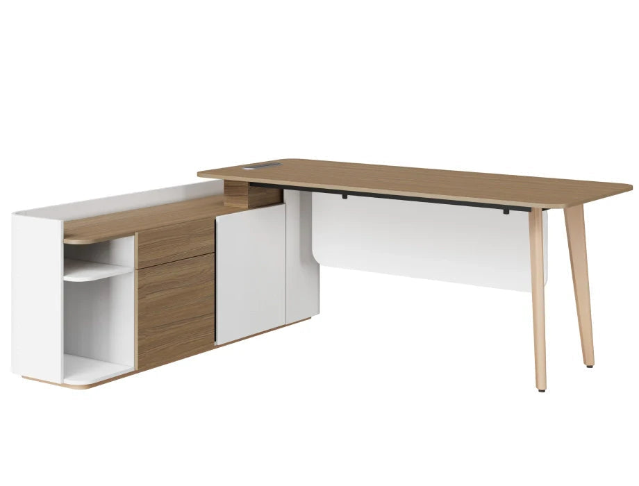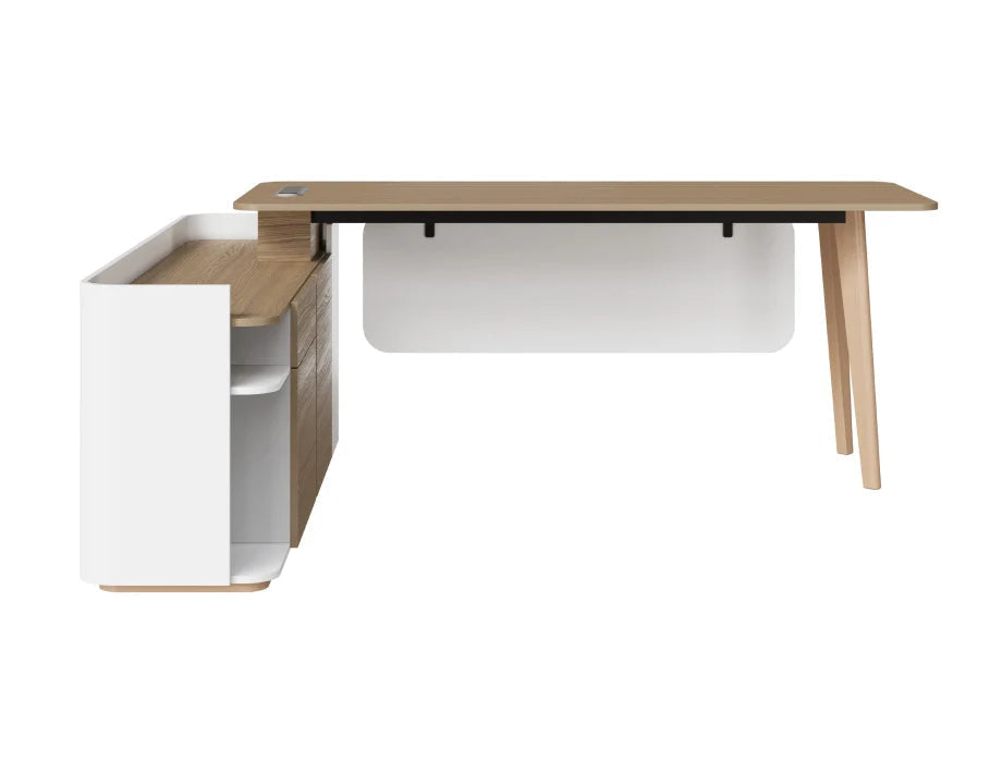 Elevate your workspace with the Orwell Manager Desk – a seamless blend of style, functionality, and ergonomic design. Featuring a generously sized classic ash laminated top and a sleek white laminated vanity panel, this desk offers a professional aesthetic while ensuring practicality. The curved side rack, finished in a mix of classic ash and white laminations, adds visual interest and offers multi-functional storage for everyday office essentials. Supported by natural finish ash wood legs, Orwell combines a spacious layout with smart cable management, making it ideal for modern office setups.